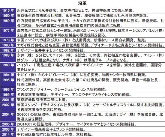 同社は看護師、医師、患者向け等の医療白衣の専門メーカーである。その歴史は古く、1915年に「永井商店」として創業。その後は全国へと業容を拡大し、現在では看護師向け白衣においては国内シェア60%超を誇る医療白衣のトップメーカーとなっている。
