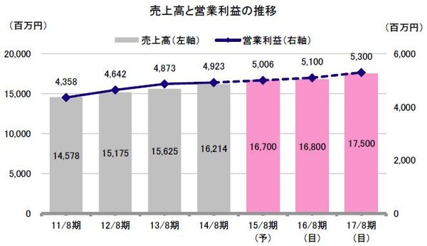 以前から掲げていた中期経営計画では、2016年8月期に売上高16,800百万円、営業利益5,100百万円を目標としてきたが、今期中にも達成の可能性があるため、同社は新しい中期経営計画で2017年8月期に売上高17,500百万円、営業利益5,300百万円とする数値目標を発表した。海外生産の拡大や利幅の大きい高機能性商品の強化を通じて、この目標達成を図る考えだ。このほか、株主還元にも前向きであり今回も公開買付けにより約110万株の自社株買いを行うことを発表した。