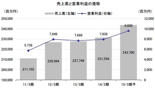 2015年3月通期の業績は売上高243,700百万円(前期比5.3%増)、営業利益9,600百万円(同20.9%増)、経常利益9,400百万円(同17.4%増)、当期純利益5,400百万円(同23.6%増)と予想されている。売上高の回復に加えて、全社を挙げて収益性改善に取り組んでおり、利益率の大幅改善を見込んでいる点は注目に値する。