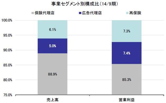 同社の事業は保険代理店事業、広告代理店事業、再保険事業の3つの事業に区分されている。事業別の構成比で見ると、保険代理店事業が売上高、営業利益ともに9割弱を占める主力事業となっている。今後は子会社で展開する再保険事業を強化していく方針で、中長期的には保険代理店事業と再保険事業を収益柱とするダンベル型ビジネスモデルの確立を目指している。