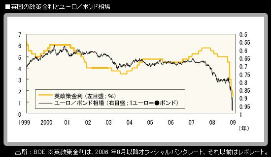 英ポンドは、2007年4月から2008年7月にかけての時期には、高い金利水準を主因に投資資金が流入したことから、対米ドルで1ポンド=2ドル前後という歴史的なポンド高ドル安水準で推移していた。住宅バブル崩壊で景気悪化見通しが徐々に強まる中で、2007年12月、2008年2月、4月にイングランド銀行(BOE)が0.25%利下げに動いても、相対的な金利の高さからポンドは底堅く推移していた。しかし昨年8月頃からは、金融市場バブルに依存していた英国経済が負った傷の深さが意識されるようになり、ポンド下落が加速。11月には1ポンド=1.5ドルを割り込んだ。