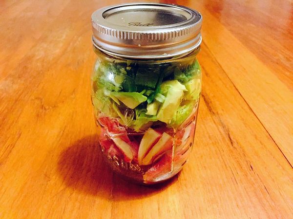 ジャーサラダ。ドレッシングをいちばん下に入れ、根菜類の固いものから順に上に重ねていく。簡単な作り方で、見た目にかわいらしいサラダが出来上がる