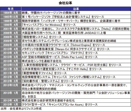 同社は現在の代表取締役会長兼社長・堂山道生(どうやまみちお)氏により1984年に設立された。最初の製品は私立学校向け「学校法人会計管理システム」であった。私立学校向けパッケージソフトはその後、現在の主力商品である「キャンパスプラン」シリーズへと進化・発展し、経営の柱に成長している。