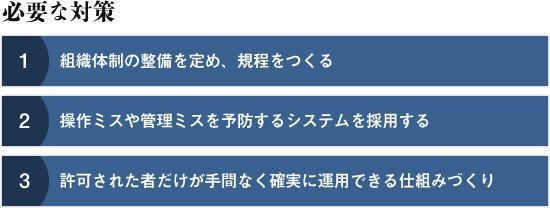 誤操作や管理ミス、紛失などによる情報漏えいは悪意がないものの、結果として情報が外部に流出するということに変わりはありません。