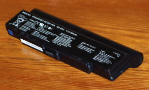 26カ月でパソコン側のバッテリー管理ソフトから認識不能になってしまったバッテリー。写真は無償交換されてきた新品。オプションの大容量品を選び、しかも容量ぎりぎりまで使い切ったことはほとんどなく、たいていは外部電源を接続して使っていたのだが。出力11.1Vなので4セル直列構造と思われる。さすがにソニーの電池は日本製(ソニーエナジー・デバイス社が製造しているはず)。ちなみにこの容量の電池で電気自動車を走らせようとすれば2000本以上が必要(現状の航続能力でも)。