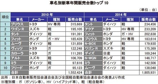 2014年の車名別新車販売ランキングでトップ10入りした普通車は、トヨタのハイブリッド専用車である「プリウス」と「アクア」、ホンダのガソリン車併売モデルの「フィット」の3車種にとどまった。「フィット」は、ハイブリッド比率が6割を超える。残りの7車種は、すべて軽自動車であった。表には、参考のために2010年のトップ10も掲載した。この4年間で人気車種が大きく変わったことがわかる。