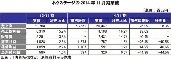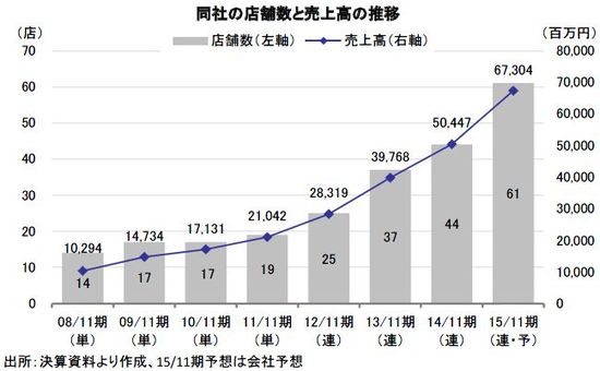 2014年11月期の連結業績は、売上高が前期比26.9%増の50,477百万円、営業利益が同26.3%減の757百万円、経常利益が同44.2%減の591百万円、当期純利益が同44.2%減の326百万円となった。4期ぶりの減益であり、利益面で期初計画比を大きく下回った。期中に10店舗の新規出店をする一方、3店舗の退店を行った。新規出店よる大幅な増収効果は、天候不順や消費増税の影響で打ち消された。
