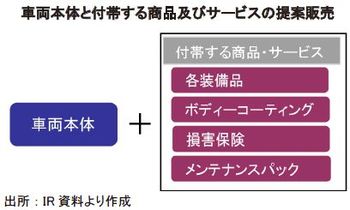 専門店化により特定車種に関する過去の販売データが蓄積され、車両販売時に購入された各種装備品、ボディーコーティング、損害保険、メンテナンスパックなどのデータを蓄積し、統計的な手法で購買率を把握することができる。店舗の販売員は、それらのデータに基づき車種に応じてカーナビ、セキュリティ、ETCなどの装備品やサービスを提案するクロスセルができる。クロスセールは、1台当たりの販売金額を増加させ、顧客の10人中9人は、何らかの付帯商品・サービスを購入している。これらの装備品やサービスはメニュー化されており、販売価格の透明性を高めている。顧客ニーズに適合する提案を行うことで、顧客満足度の向上が図れる。また、カーナビなどの自動車用品を大量発注することで、調達コストを抑えている。