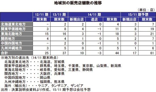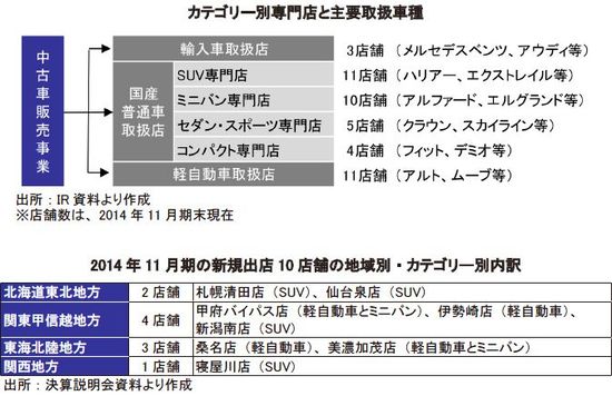 オートオークションによる仕入を前提にすれば、地域ごとに市場規模、ユーザーニーズ、競合状況、自社の強みを考慮して新規出店が可能になる。同社は、愛知県名古屋市を本拠とし、2014年11月期末時点で17都道府県に36拠点、44店舗を運営している。このような広域で中古車販売事業を展開している会社は少なく、また多数の新規出店を継続している会社も見当たらない。同社は、前期までの3年間で店舗数を2.3倍に増やした。広範な地域での出店と多店舗展開を進めてきたことで、徐々に新規出店の成功パターンとそれを支える事業体制が整ってきた。今後は、長期目標に向かって、出店ペースを加速する。