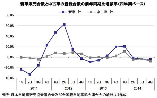 2014年の個人消費は、総じて、駆け込み需要の反動により第2四半期(4-6月)に低迷するものの、それ以降は徐々に回復に転じると見込まれていた。ところが、実際の新車販売台数は、前年同期比の増減率が第2四半期の△1.9%から第3四半期に△3.6%へ、さらに第4四半期が△4.4%へと落ち込み幅が拡大した。