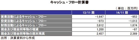同社は、2014年11月期に新規出店による棚卸資産の増加と自社割賦に伴う売上債権が増加したため、営業活動のキャッシュ・フローが953百万円のマイナスとなった。投資活動によるキャッシュ・フローは、1,013百万円の支出となった。新規出店に関わる仕入、有形固定資産の取得と差入保証金の差入など資金ニーズが高まり、有利子負債が増加した。今後は、増益により営業活動によるキャッシュ・フローがプラスに転じることを目指す。