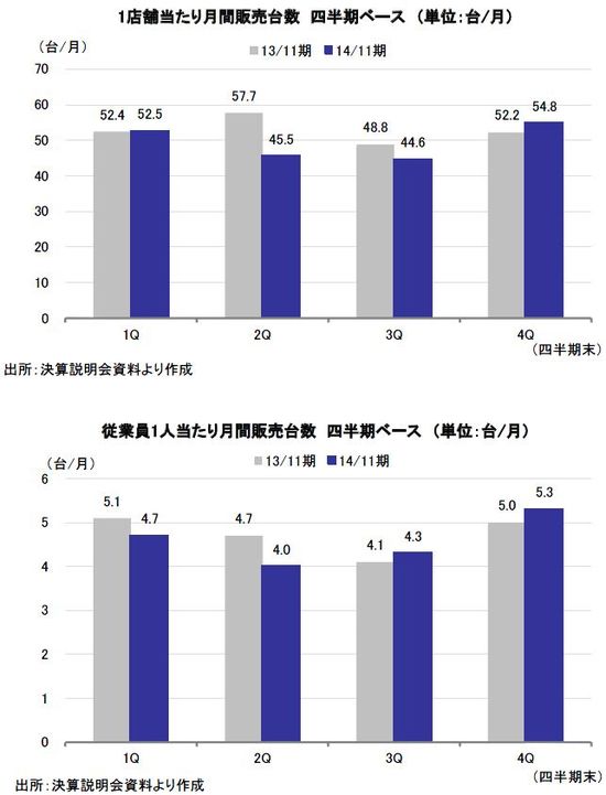 同社は、2014年4月の消費税率引上げ前の駆け込み需要を取り込む営業活動をしたものの、2月の大雪により関東甲信越地方の店舗における週末の来店客数が2週続けて減少した。増税後は、消費者による贅沢品であるクルマの買い渋りが見られた。成約の低迷により在庫の鮮度が落ちたため、8月に創業以来の大規模な処分をオートオークションで敢行した。見切り売りが一時的に収益性を毀損したものの、在庫の入れ替えが奏功して第4四半期(9月-11月期)は1店舗当たり並びに従業員1人当たりの月間販売台数が前年同期の水準を上回った。