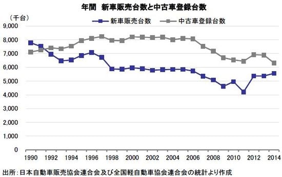 日本は、人口減少と少子高齢化により自動車販売市場が縮小傾向にある。国内新車販売台数(登録車+軽自動車)は、1990年に778万台でピークを打ち、2014年は556万台に減少した。中古登録車は、1997年の824万台が最高水準である。2014年1月-11月の累計登録台数は、631万台となった。過去のピークからの下落幅は、新車の3割弱に対し中古車が2割弱にとどまる。