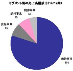 同社の事業は米穀事業、食品事業、飼料事業、鶏卵事業に分かれる。2014年12月期のセグメント別売上高の割合は米穀事業が80%と大部分を占めており、続いて食品事業が8%、飼料事業が7%、鶏卵事業が5%となっている。