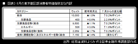 8月の東京都区部消費者物価指数(全国CPI)は、「生鮮食品を除く総合」(コア)が前年同月比▲1.1%で、マイナス幅は前月から0.2%ポイント縮小した(弊社予想通りの数字)。コア前年同月比の押し上げには、「電気代」「都市ガス代」「家賃」「生鮮食品を除く食料」「航空運賃」「移動電話通信料」などが寄与。一方、押し下げには、「教養娯楽用耐久財」「被服及び履物」「ガソリン」などが寄与した。
