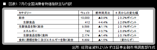 8月27日に総務省から発表された7月の全国消費者物価指数(全国CPI)は、「生鮮食品を除く総合」(コア)ベースで前年同月比▲1.1%となり、マイナス幅は前月から0.1%ポイント拡大した。コア前年同月比の押し上げには、「電気代」「都市ガス代」「被服及び履物」などが寄与。一方、押し下げには、「ガソリン」「灯油」「生鮮食品を除く食料」「外国パック旅行」「高速自動車国道料金」などが寄与した。