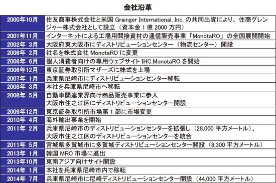 同社は2000年10月、住友商事<8053>と米国の大手間接資材販売会社であるグレンジャー社の出資により「住商グレンジャー株式会社」として創業された。翌2001年、間接資材に特化した通信販売MonotaRO.com(以下、「モノタロウ」)を開始。Webサイトとカタログを通じた間接資材販売により、中小企業を中心に顧客基盤を拡大し続けている。2015年1月現在の口座数は140万件に上り、取り扱い点数は800万点、当日出荷製品は30万点を超える。
