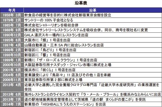 同社は1958年に(株)新宿東京会館として設立された後、1979年2月にサントリーの100%子会社となった。1988年に(株)サントリーレストランシステムを吸収合併して商号を現社名に変更して以来、サントリーグループの外食事業の中核子会社として発展を遂げてきた。