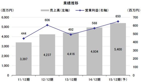 2015年12月期は売上高が前期比9.4%増の5,400百万円、営業利益が同14.3%増の650百万円と増収増益が続く見通し。フィールドマーケティング事業の好調が続くほか、eセールスマネージャー関連事業も利便性をさらに高めた製品開発を進めることで顧客数の拡大を目指す。同事業では売上拡大を重視しており、今期は中堅・中小企業向けに強い販売チャネルを持つ企業との協業も強化しながら、2ケタの売上伸長を目指していく考えだ。