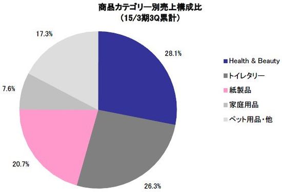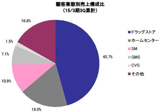 同社の売上高を商品カテゴリー別で見ると、2015年3月期の第3四半期累計期間では、Health & Beauty分野が28.1%、トイレタリー分野が26.3%、紙製品が20.7%と主要3分野で全体の約75%を占めている。また、顧客の業態別で見ると、ドラッグストアが45.7%、ホームセンターが18.0%と両業態で全体の6割を超える比率となっている。