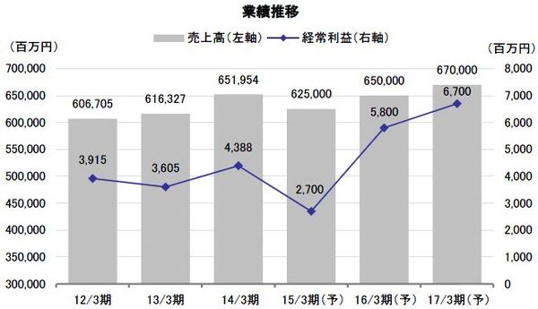 2015年3月期の会社計画は、売上高が前期比4.1%減の625,000百万円、経常利益が同38.5%減の2,700百万円となっている。2014年3月期の第4四半期が駆け込み需要で伸びたため、反動による減益幅が拡大する見込みとなっているが、紙製品の値上げが進んだことや外国人訪問客の増加によるインバウンド消費の拡大を受け、2014年12月の売上高は前年同月比7%増と回復色が鮮明となっており、1月も同様の傾向が続いていること、また、収益の足かせ要因となっていた受託物流事業の収益性が改善してきたことなどから、会社計画を達成する可能性は高いとみられる。