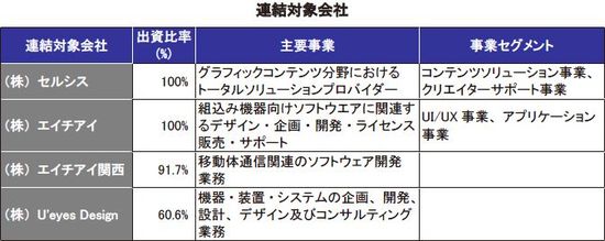 グループ各社を事業セグメント別に見ると、セルシスはコンテンツソリューション事業及びクリエイターサポート事業、それ以外のエイチアイ、エイチアイ関西、U'eyes DesignはUI/UX事業及びアプリケーション事業に位置付けられる。