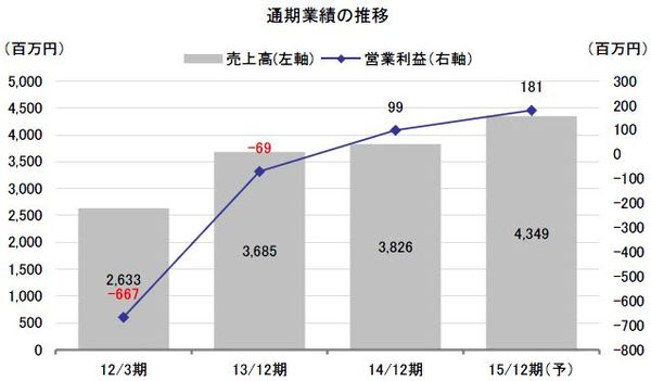 2012年の上場以来、営業赤字が続いていたが、取り組んできた構造改革と戦略投資の効果が顕在化し、2014年12月期は営業黒字を達成した。2014年12月期連結業績は、売上高3,826百万円(前期比140百万円増)、営業利益99百万円(同168百万円増)。2015年12月期計画は、売上高4,349百万円(前期比522百万円増)、営業利益181百万円(前期比81百万円増)を見込んでいる。
