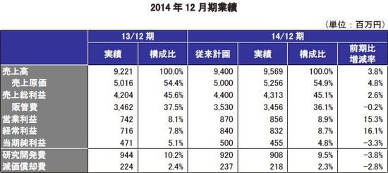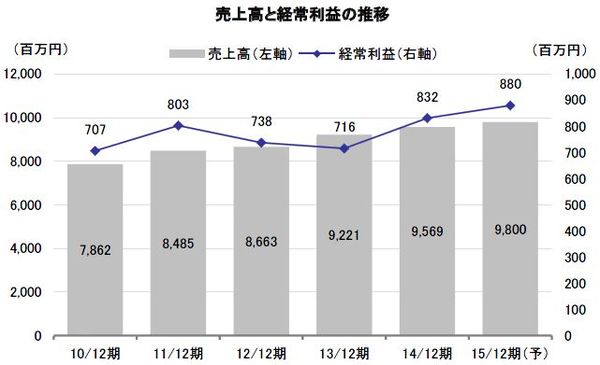 以上の特長を踏まえたうえで、業績を見てみる。2014年12月期決算(非連結)は、売上高が2013年12月期比3.8%増の9,569百万円、営業利益が同15.3%増の856百万円、経常利益が同16.1%増の832百万円、当期純利益が同3.3%減の455百万円となった。売上高は6期連続、営業・経常利益は過去最高を更新した。これは、同社の安定したビジネスモデルを象徴するような業績と評価できよう。