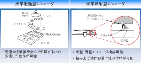 反射型エンコーダは発光素子と受光素子を単一表面上に実装し、薄型化と小型化を実現している。一方の透過型エンコーダは、LED発光部と受光IC部がコードホイールを挟む形式になっているため部品の形状が大きい。しかし、古くから多くのモータ制御に使われてきたため、業界のスタンダードとして広く普及している利点がある。