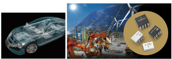 電気的に絶縁しながら信号を伝達できるフォトカプラは、産業用ロボット、電力インバータ*3、太陽光発電装置から電気自動車など、幅広い用途で使われている。