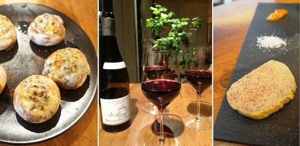 人気の前菜2品。左:ブルーチーズ詰めマッシュルームのオーブン焼き 右:焼酎風味のフォアグラ ワインはフランスのものが中心だが、いずれは日本のワインも提供したいそう(料理の写真:筆者撮影)ギャラリーページへ