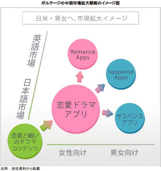 同社のドラマアプリは、ジャンルによって大きく2つに分類される。1つは“恋愛”をテーマにした「恋愛ドラマアプリ」で、もう1つはサスペンスをはじめとした“戦い”をテーマにした「サスペンスアプリ」だ。恋愛ドラマアプリは、戦略的に女性ユーザーをターゲットとしたもので、現在の収益の柱となっている。サスペンスアプリは、2013年5月からスタートした新規事業で、男性ユーザーの取り込みを意識しており、将来的に恋愛ドラマアプリと並ぶ収益源となることが期待されているものだ。