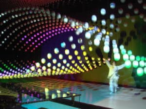 来場者らの失望した表情を和らげたのは、最後に通された劇場でのパフォーマンスだった。天井から糸でぶらさがる約1000個の「玉」による造形パフォーマンス、なんでも