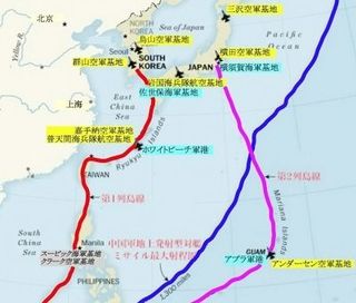 この戦略構想を具体的に図式化するために用いられている概念が「第1列島線」と「第2列島線」である(下の図の赤いラインが「第1列島線」、ピンクのラインが「第2列島線」である)。これら2本の防衛線のうち中国から見て外側の第2列島線にアメリカ軍戦力を近づかせずに撃退する、というのが接近阻止(A2)戦略である。そして中国から見て第1列島線の内側は中国が完全に支配すべき領域であり、アメリカ軍戦力を絶対に展開させない状態を維持する、というのが領域拒否(AD)戦略である。