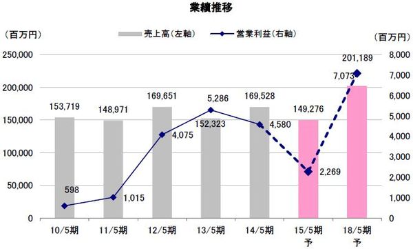 2015年1月14日付で発表された2015年5月期の第2四半期累計連結業績は、売上高で前年同期比8.5%減の66,966百万円、営業損失で1,520百万円(前年同期は28百万円の黒字)となった。消費増税後の需要反動減による注文住宅の受注低迷が要因だ。また、受注低迷の長期化や、消費税率再引き上げの延期による再度の駆け込み需要が見込めなくなったことで、通期業績の下方修正も同時に発表。売上高で前期比12.0%減の149,276百万円、営業利益で同50.4%減の2,269百万円と2期連続の減益となる見通しだ。