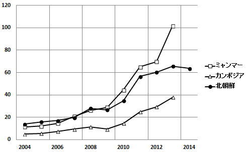 中国と北朝鮮との交易額(輸出額+輸入額)を図に示す。この図には比較のために、中国の周辺にある貧しい国々ミャンマー、カンボジアをも加えた。ものごとは、比較して見ると、その本質がよく分かる(注:北朝鮮についてはネット情報によって2014年の値も付け加えた)。