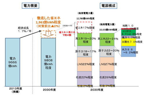 2014年来、経済産業省において2030年の我が国のエネルギー供給のあり方をめぐる「エネルギーミックス」(電源構成)について議論されてきたが、このたびようやく一定の方向性が示された(総合資源エネルギー調査会 基本政策分科会 長期エネルギー需給見通し小委員会・第8回 平成27年4月28日)。