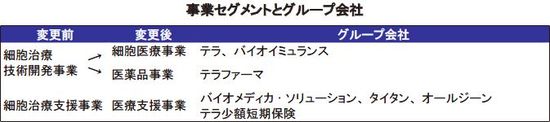 同社はがんワクチンの1つである樹状細胞ワクチン「バクセル®」を中心に、医療機関に対する技術・運用ノウハウの提供、及び再生・細胞医療に関する研究開発を行う企業である。また、事業領域を拡大し6つの連結子会社を有している。2014年12月期より、樹状細胞ワクチン「バクセル®」の薬事承認取得に向けた開発活動を本格化したことに伴い、事業セグメントを表の通り、細胞医療事業、医薬品事業、医療支援事業の3つに区分変更した。