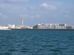 海から見たル・アーヴル。左にそびえている塔がサン・ジョセフ教会
