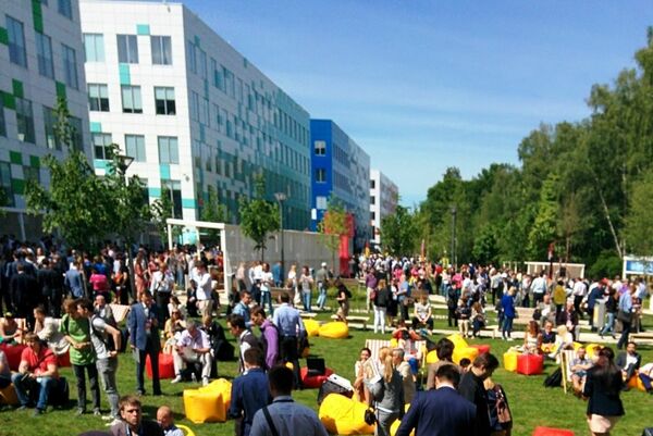 スタートアップ・ビレッジ会場の様子。 後方の建物がテクノスパーク
