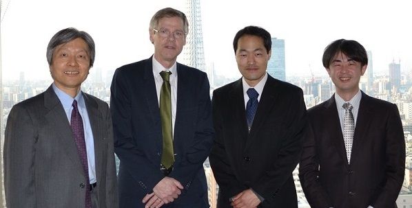 2015年マルクス・ヴァーレンベリ賞の受賞者たち。左から東京大学大学院農学生命科学研究科 磯貝明教授、マルクス・ヴァーレンベリ財団事務局長 カイ・ローゼン教授、西山義春博士(フランス国立科学研究所植物高分子研究所上級研究員)、東京大学大学院農学生命科学研究科 齋藤継之准教授(写真提供:カーボンニュートラル資源研究所・藤原秀樹)