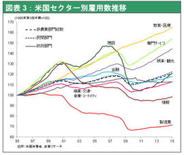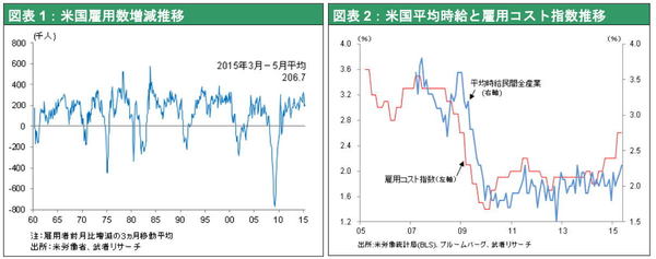 5月米雇用統計では、非農業部門雇用者数が前月比28.0万人増と市場予想を上回り、過去2カ月分も3.2万人上方修正された。業種別雇用者数では、(原油価格下落の影響による)天然資源・鉱業が5カ月連続で減少したのみで、それ以外はほぼ全分野で増加した。特に小売、教育・医療、娯楽・宿泊など家計需要関連業種が堅調だった。またリーマンショック後の雇用喪失3部門である製造業、建設業、政府部門の回復が顕著になっており、雇用回復の裾野が広がっている。失業率は5.5%と前月の5.4%から上昇したが、それは求職をあきらめていた人の労働参加率が上昇したことによるもので心配はない。