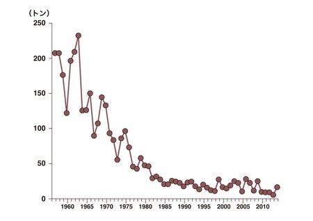 シラスウナギの国内漁獲量の推移(参考:農林水産省「漁業・養殖業生産統計年報」(1957~2002年)、2003年以降は水産庁調べをもとに編集者作成)