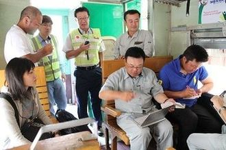 列車がヤンゴン駅を発車する直前、専門家から測定の流れについて説明を受けるOJT生たち