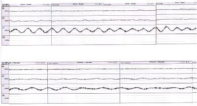 軌道整備前(上)と後(下)の列車動揺の測定例(日本鉄道施設協会誌 2014年2月号より転載)
