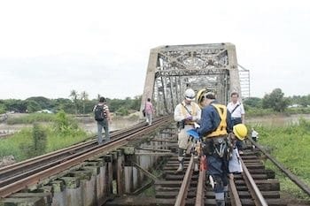 ここは、ヤンゴン中央駅から車を40分ほど北東方向に走らせたピンロン地区に架かる鉄橋の上。水面からの高さは10メートルぐらいか。雨期明けを間近に控えたこの時期は、川の水位も最高時に比べるとだいぶ下がっているという。
