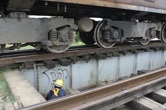 列車のすぐ真下で黄色のヘルメットをかぶった男性が黙々と記録を続けていた