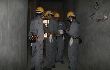 そんなビルの1つで、サクラ・インセインの第1期生たちが現場OJT訓練を行っている。2階部分に上がると、ちょうど作業服にヘルメット姿の学生たちが4人ずつ5列に並んで昼礼を始めるところだった。