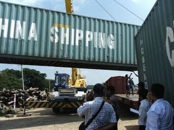 ヤンゴン港でコンテナの積み込みを見守る人々(写真提供:山九)