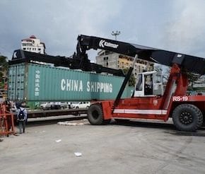 ヤンゴン港に荷揚げされたコンテナをクレーンで積み込む(写真提供:JR貨物)